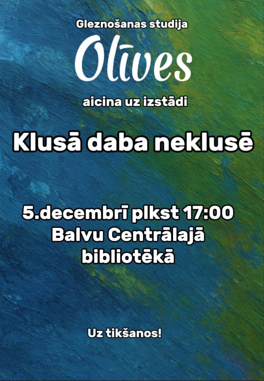 Gleznošanas studija ‘’Olīves’’ ielūdz uz izstādi ‘’Klusā daba neklusē‘’, kurā apkopoti studijas dalībnieku darbi klusās dabas žanrā.