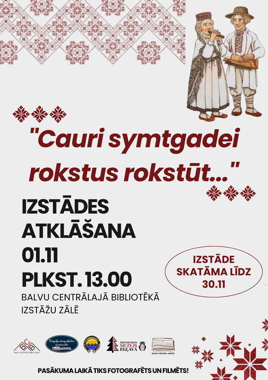 Balvu Centrālā bibliotēka aicina uz izstādes “Cauri simtgadei rokstus rokstūt” atklāšanu, kas notiks 1. novembrī plkst. 13.00 bibliotēkas izstāžu zālē.