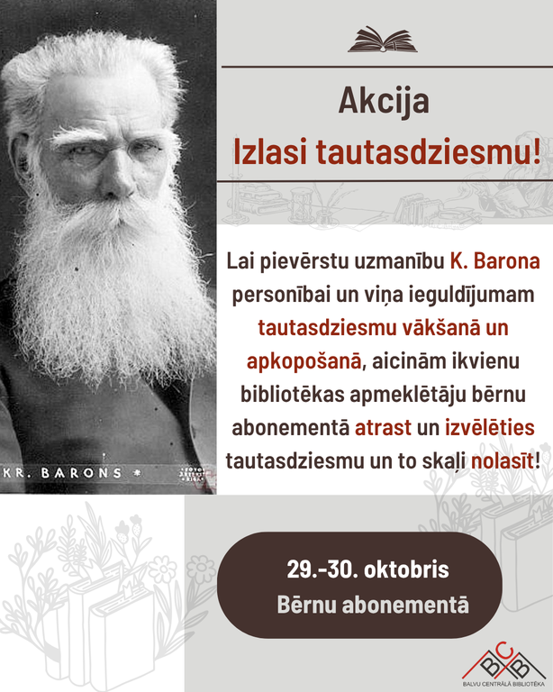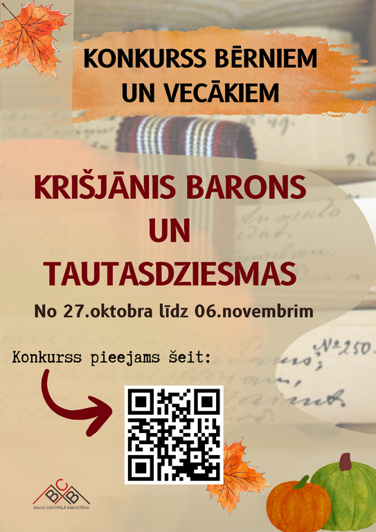 Balvu Centrālā bibliotēka aicina bērnus un vecākus piedalīties konkursā “Krišjānis Barons un tautasdziesmas”, kas norisināsies no 27. oktobra līdz 6. novembrim.
