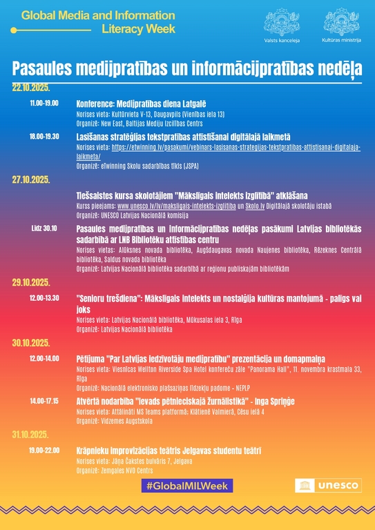No 2025. gada 24. līdz 31. oktobrim Latvijā norisinās Pasaules medijpratības un informācijpratības nedēļa, kuras mērķis ir veicināt medijpratību un informācijpratību sabiedrībā, lai uzlabotu cilvēku kritiskās domāšanas prasmes informācijas, mediju un tehnoloģiju jautājumos.