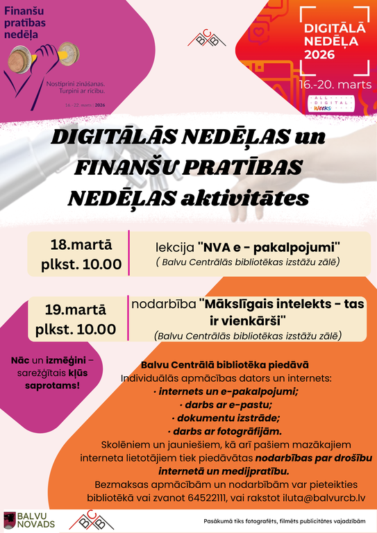 No 16. līdz 20. martam visā Latvijā un arī pie mums, Balvu Centrālajā bibliotēkā, tiek atzīmēta Digitālā nedēļa 2026 un Finanšu pratības nedēļa.