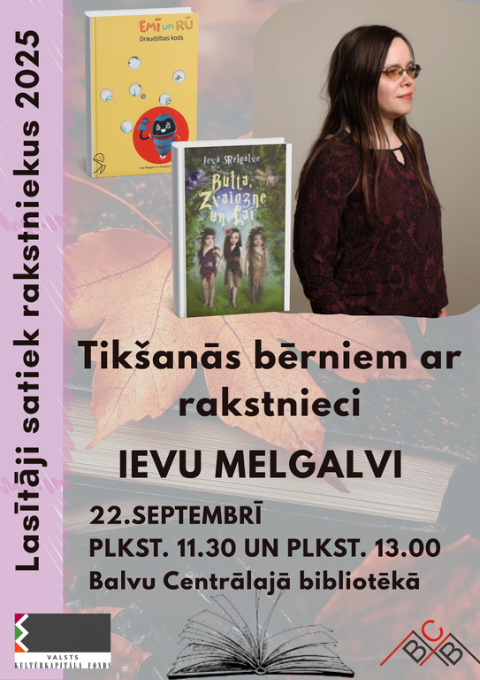 22. septembrī Balvu Centrālajā bibliotēkā viesosies rakstniece Ieva Melgalve – bērnu un jauniešu grāmatu autore, kas stāsta par draudzību un fantāzijas pasaulēm. Ieva Melgalve literatūrā darbojas kopš 12 gadu vecuma. Viņa studējusi kultūras teoriju un sociālo un kultūras antropoloģiju, vada Literārās Akadēmijas prozas meistardarbnīcu un pasniedz Latvijas Mākslas akadēmijā.