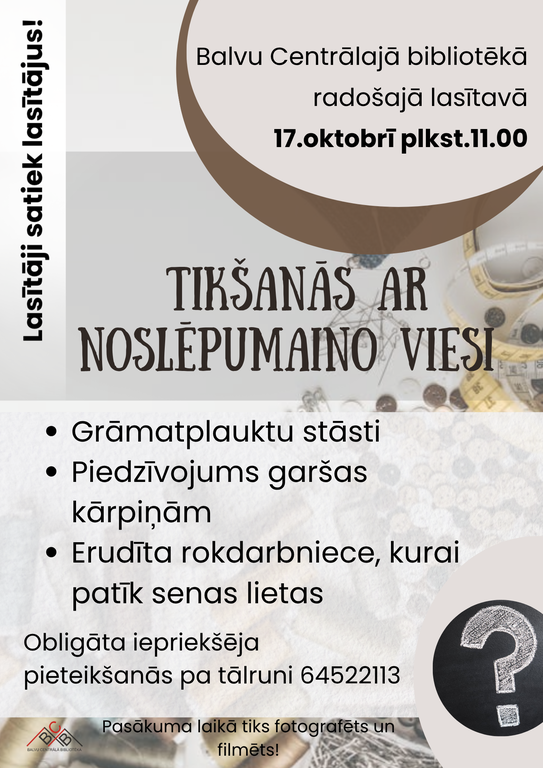 Pasākums notiks 17.oktobrī plkst.11.00 Balvu Centrālajā bibliotēkā.